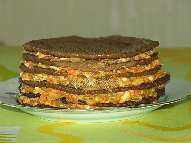 выкладываем фарш на печёночный блин, накрываем другим блином и т.д.