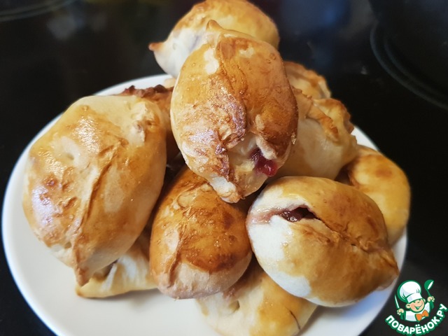 Я смазываю растительным маслом стол, выкладываю тесто, разделяю на равные шарики, из каждого шарика делаю руками лепешку, в середину выкладываю начинку, примерно 1, 5 -2 стол. ложки, скрепляю края (сильно прижимая)и кончики пирожка скрепляю между собой, укладываю на смазанный маслом противень и даю расстояться 15 минут. Я все делаю без муки, мука идет только в тесто и яйцом не обмазываю, без яйца корочка одинакового цвета, после выпечки обрызгиваю сладкой водой.