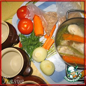 Свареные ножки остудились, собрали все продукты. Расчет на 3 горшочка.