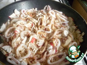 Кальмара нарезать кольцами, крабовые палочки кружочками (или полукружочками, как у меня), обжарить в небольшом кол-ве раст.масла, добавив пряности.