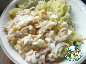 К кукурузе и капусте добавить зажарку из кальмаров и крабовых палочек,посолить и заправить майонезом.
