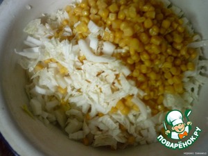 Китайскую капусту мелко нарезать, добавить к ней кукурузу из банки (БЕЗ РАССОЛА! иначе будет слишком много сока).
