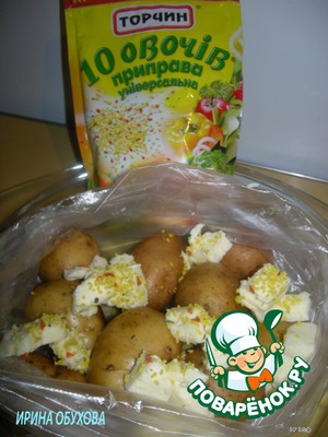 Картофель помыть, положить в кулек, нарезать сливочного масла побольше, посыпать специями или солью.