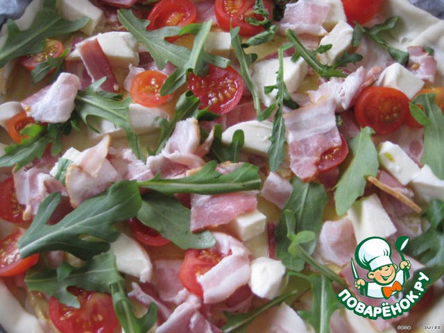 нарезанные кусочками - грудинку, помидоры, моцареллу, руколлу.