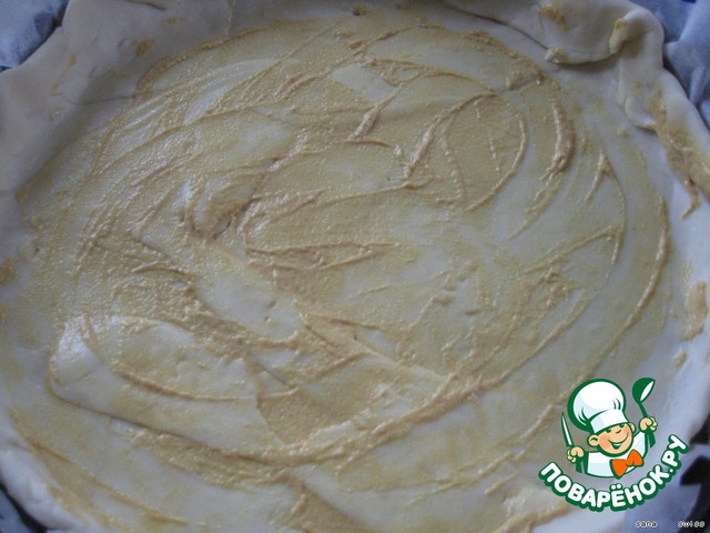 прокалываем вилочкой тесто в нескольких местах (что бы не пузырилось при запекании), смазываем горчицей. -