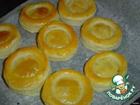 Слоеное тесто раскатайте толщиной 0, 5 см. Круглой выемкой вырежьте лепешки диаметром 4 -6 см. Половину лепешек уложите на лист, смоченный водой, смажьте желтком, отступив на 0, 2 см от края. У другой половины вырежьте середину выемкой меньшего диаметра и уложите кольца на лепешки так, чтобы края их совпали. Смажьте поверхность волованов желтков, аналогично первому разу. Выпекайте до готовности при температуре 250 гр.