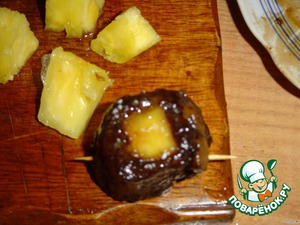 Очистите ананас от кожицы и нарежьте кубиками по 1 см. Оберните каждый кубик ананаса полоской мяса и скрепите зубочисткой. Жарьте в духовке 2 минуты при температуре 270 гр. , переверните и жарьте еще 2 мин.