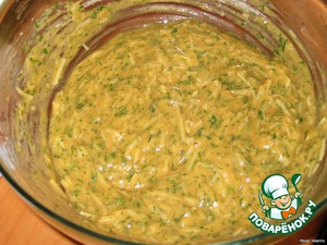 Готовим кляр: яйца взбиваем с солью, перцем, кетчупом до однородной массы. Добавляем туда мелко нарезанные петрушку и укроп и тертый на мелкой терке пармезан, перемешиваем. Всыпаем муку и вымешиваем до однородности, получается примерно как на оладьи тесто.