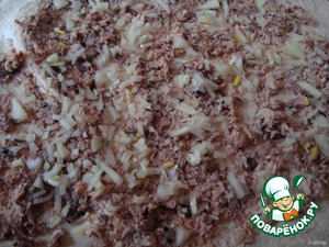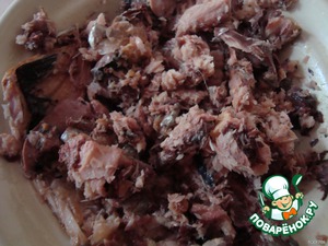 Из консервы достать рыбу и размять ее вилкой.