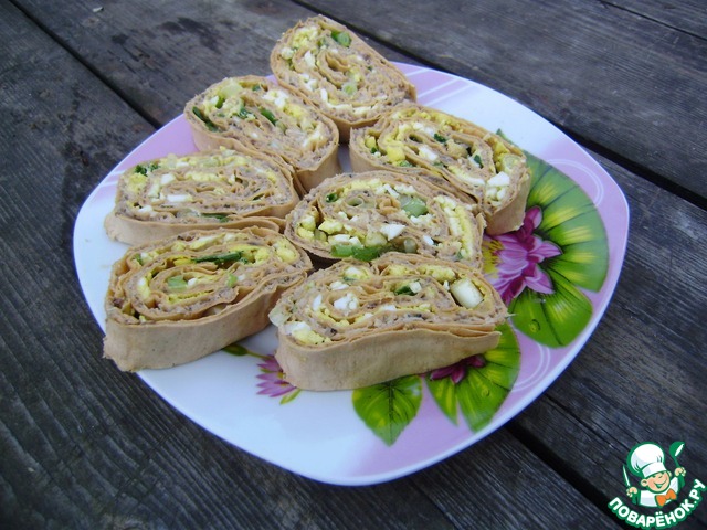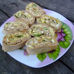 Засыпать яйцами.И еще сверху смазать майонезом. Сворачивает трубочкой. Дать немного пропитаться лавашу, нарезать порционными кусками.
