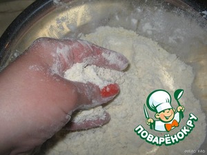 И руками замешиваем тесто. Сначала оно будет рассыпаться в руках, запаситесь терпением и немного помесите.
