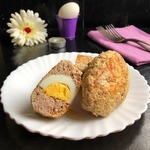 Приготавливаем фарш: картофель и лук перемолоть на блендере, добавить в фарш, также добавляем специи и 2 зубчика чеснока, пропущенных через пресс, хорошо перемешиваем фарш, укладываем в него 2 почищенных яйца и формируем курочку (на ваше усмотрение, мы можете придать любую форму), рядом с курочкой сделать из этого фарша цыплят.
