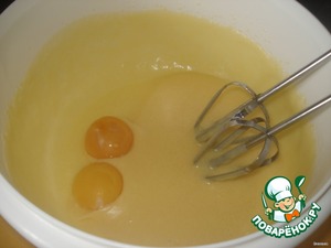 Подтаявшее масло и сахар взбить миксером в крем. Добавить желтки и продолжать взбивать.