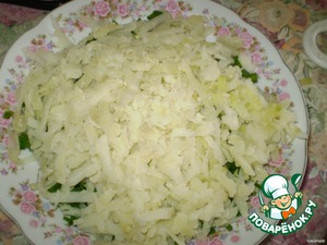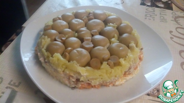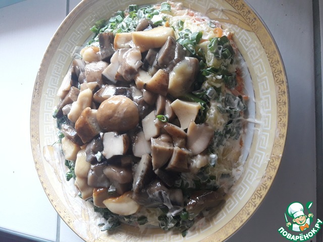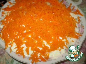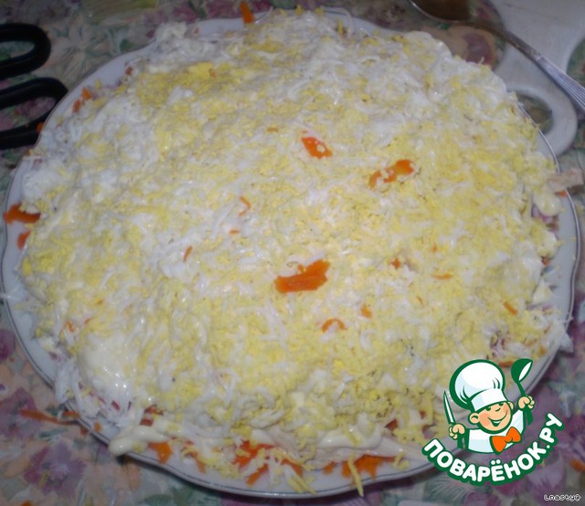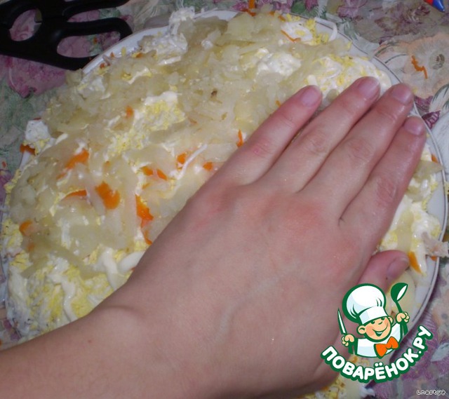 И последний шаг- тертый сыр, посыпаем им салат и рукой придавливаем к тарелке (хорошенько)