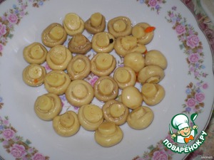Грибочки положить шляпками вниз в глубокую тарелку с пологими краями