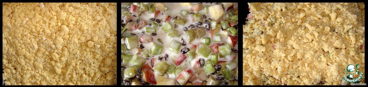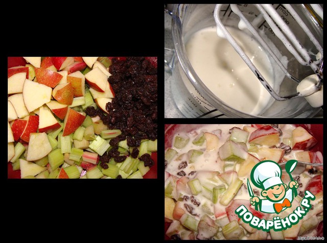 Смешиваем ревень, яблоки и изюм со взбитыми белками. -