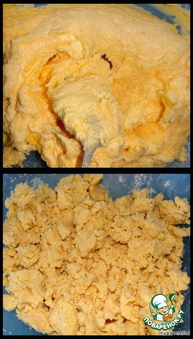 Добавить муку и разрыхлитель. Количество муки написала примерно, у вас должно получиться крошковидное тесто (на фото). -