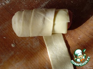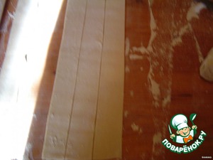 Тесто раскатайте в пласт толщиной 5 -6 мм и нарежьте на полоски.