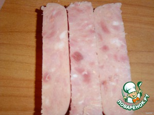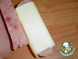 Полосками теста оберните брусочки ветчины с сыром так, чтобы очередной виток закрывал 1 /2 предыдущего.