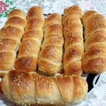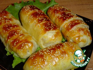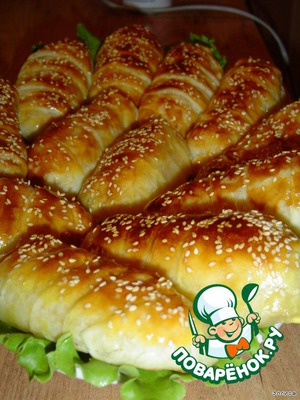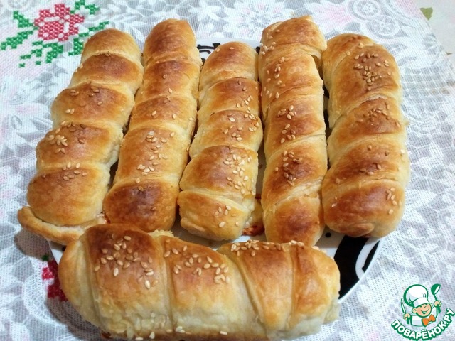 Уложите трубочки на влажный противень. Смажьте сверху желтком и посыпьте кунжутом.
