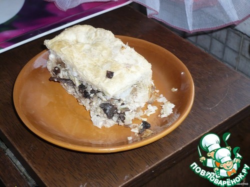 2) Тесто раскатать толщиной 5 мм. 1 -й пласт выложить в форму, смазанную маслом, затем укладывать ингредиенты слоями: курица, грибы, яйца, рис.