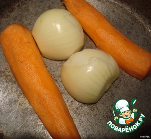 Очищенные и вымытые овощи разрезать вдоль на половинки и выложить на разогретую сковороду разрезом вниз, чтобы они испеклись до коричневого цвета. (У меня корня петрушки не было, поэтому готовила без него)
