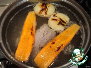 Сварить мясной бульон с испеченными овощами до готовности мяса.