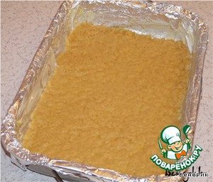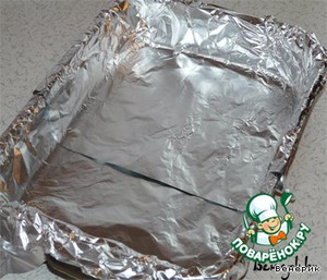 Форму размером 33см*22см застелить фольгой так, чтобы края свисали. Бока смазать сливочным маслом, (не дно).
