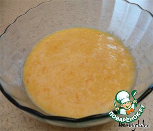 Теперь готовим начинку. Взбить яйца, сахар, муку - долго не взбивать. Добавить апельсиновый сок и цедру.