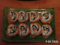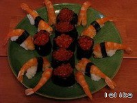 На циновку положить лист нори, выложить и разровнять рис, положить васаби, начинку, тщательно свернуть ролл и нарезать на равные части |
