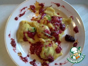 А пока равиоли варятся, можно приготовить соус. В сковороду влить вино, положить ягоды, добавить соль, перец и сливки. Когда все закипит, огонь уменьшить, ягоды размять и разбавить водой или бульоном до нужной консистенции. Сразу выключить -