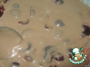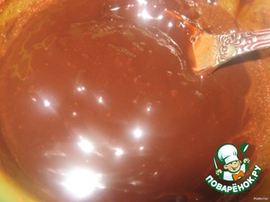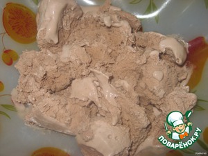 Продолжая взбивать , добавляем сливочное масло , мороженное , муку с разрыхлителем , какао. -