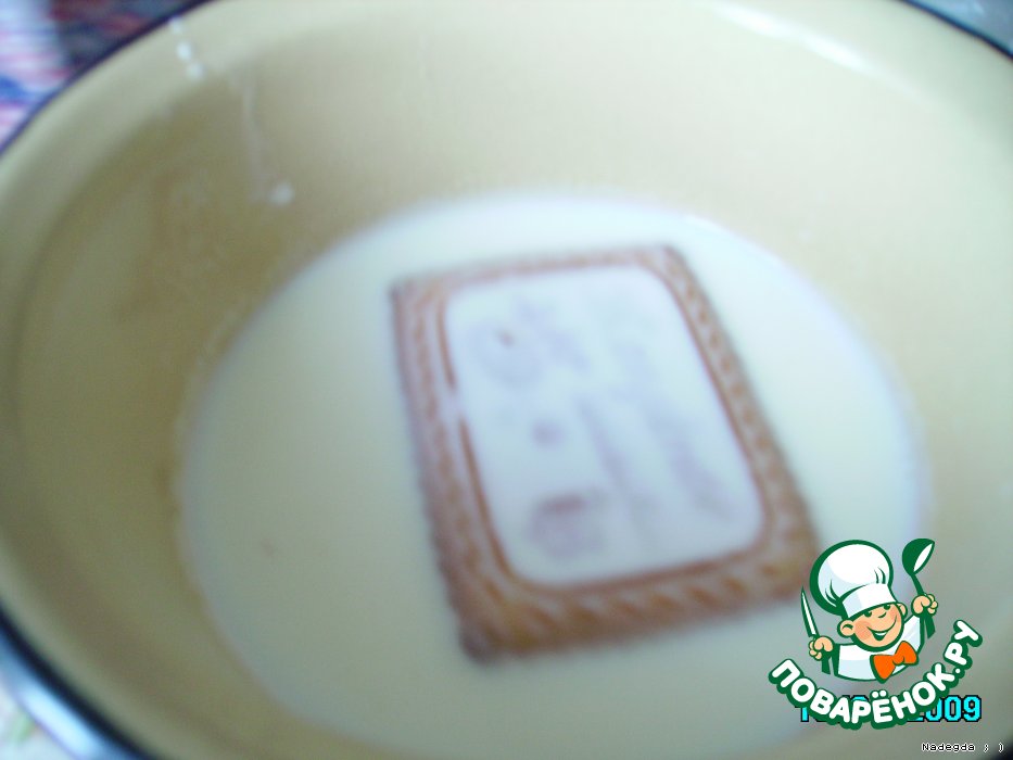Печенье смачиваем в молокe, выкладываем на фольгу или полиэтилен по 4 штуки в 3 ряда.