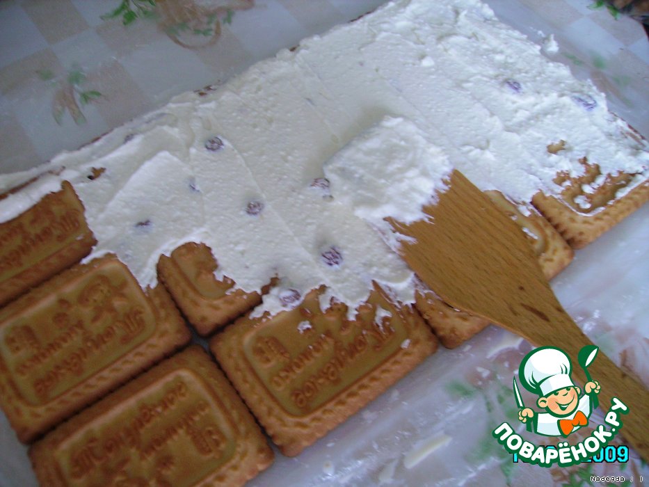 Сверху выкладываем 2 слой печенья и снова намазываем творог.