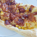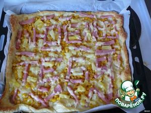 Тесто раскатываем на ширину противня, высыпаем кукурузу.