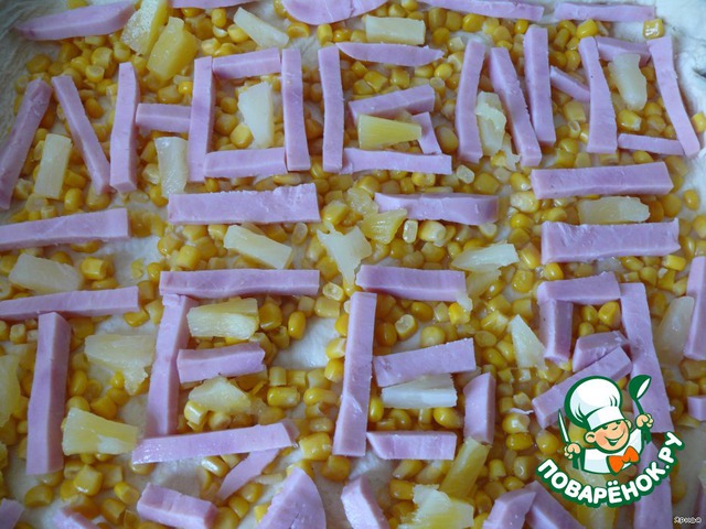 Добавляем ананасы, сверху посыпаем тертым сыром.