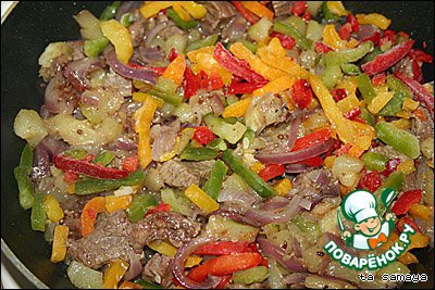 Говядина с цуккини и сладким перцем с тмином в яйце