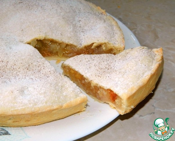 Духовку разогреть до 180 С. Дно формы для выпечки застелить пергаментом. Лепешку большего размера выложить в форму, руками вылепить бортики. Положить яблочную начинку.