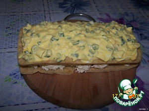 На второй корж выложить яйца с резаным зеленым луком и смазать майонезом (я смешала яйца, лук и сметану, можно слегка посолить-поперчить), накрыть третьим коржом