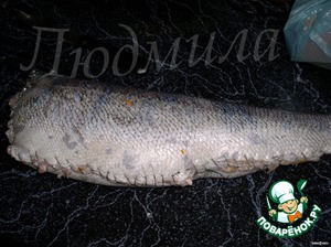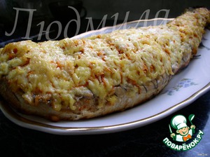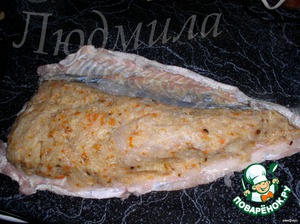 Выложить нашу рыбку на смазанный маслом противень, посыпать сверху морковкой (потереть на крупную терку) и полить немного майонезом. Я запекала в духовке при 180 гр где-то час.