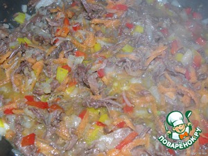 Перемешать тушенку с овощами,
