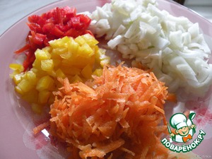 Лук, перец мелко нарезать, морковь натереть на терке