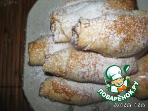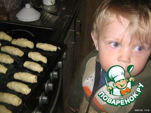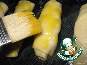 А из остатков теста я решила сделать такие же трубочки, только с сыром. Тесто ведь не сладкое. Принцип тот же, только начинка - тёртый твёрдый сыр. И сверху, после желтка посыпала кунжутом. Получилось очень даже неплохо!