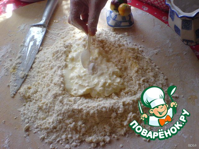 Сделайте углубление в тесте и налейте туда кефир и соду
