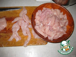 Куриные грудки нарезать длинными брусочками шириной около сантиметра.