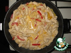 Курицу посолить, поперчить, запанировать в муке, обжарить на подсолнечном масле на большом огне в течение 5 минут, постоянно помешивая. Выложить из сковородки.