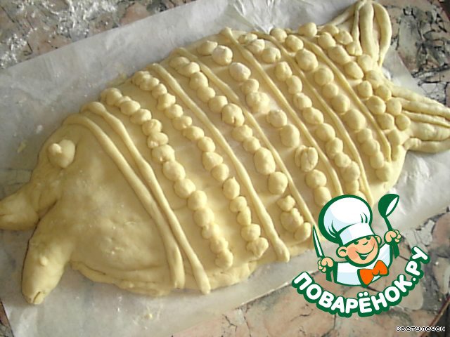 • накрываем второй половиной раскатанного теста, защипываем края и придаём форму рыбки, делаем из теста чешую, глазки, хвостик, ротик.