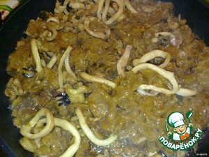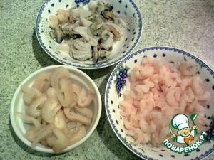 • Подготовить морепродукты. У меня осталось немного морского коктейля, 1 кальмар и креветки (меняйте – все на Ваш вкус)