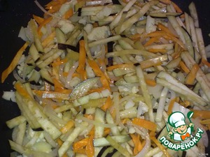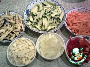 • Нарезать овощи тонкой соломкой. Количество овощей, как и их состав, можно поменять в зависимости от своего вкуса.