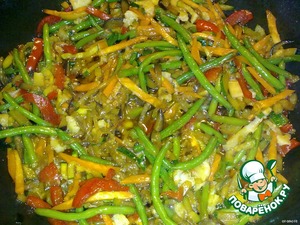 • В разогретую сковороду вок с растительным маслом поочередно выкладывать овощи (сначала те, которые плотнее и будут жариться дольше – морковь, лук). Жарить на большом огне, чтобы жидкость выпаривалась, без крышки